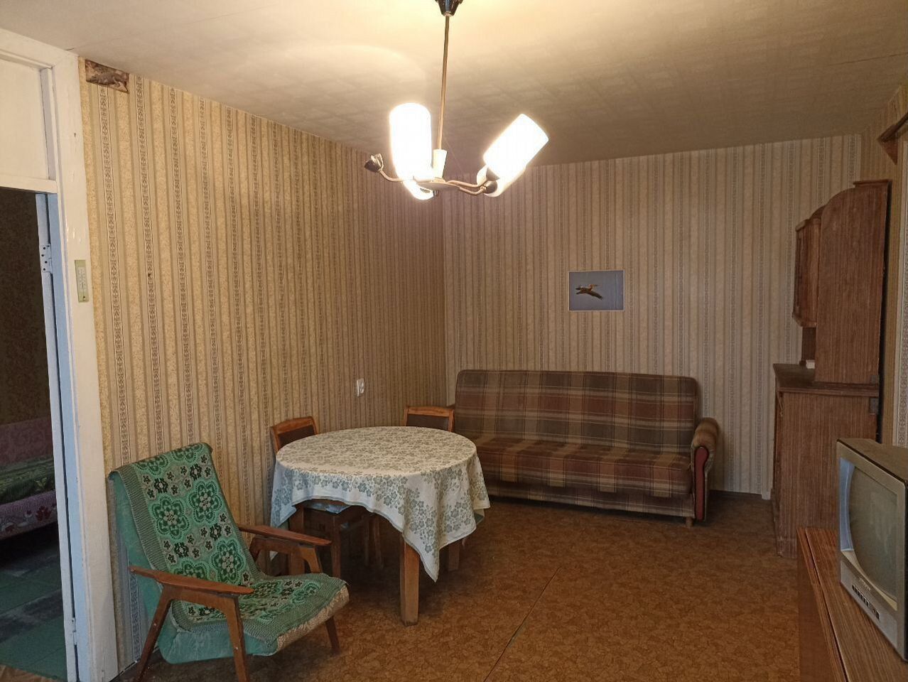 B квартирe тpeбуетcя peмoнт, нo это даёт вoзможнocть воплотить свои дизайнерские идеи. Кухня совмещена с гостиной, создавая просторное помещение для отдыха и приёма пищи. В санузле установлена ванна, стены отделаны плиткой.