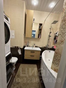 Большой совмещенный санузел вмещает в себя полноразмерную ванную, вместительную тумбу с раковиной, унитаз, стиральную машину и сушилку.